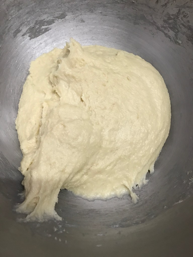 - Masukkan butter, mixer low speed sampai rata kemudian mixer high speed sampai adonan kalis